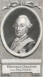 Friedrich Christoph von Saldern (2 January 1719 – 14 March 1785) was a Prussian general and military writer. He proved his organizational mettle with the battlefield clean up after Liegnitz in 1760. At the Battle of Torgau he proved his tactical and command mettle in the assault Austrian lines, which changed the course of the battle. His refusal to sack Hubertusburg in 1763 led to his resignation from the army.[1] Despite retirement from command, however, Frederick the Great promoted him to lieutenant general and made him inspector of troops. Saldern wrote at least two missives on infantry tactics. He received the Order Pour le Mérite and the Order of the Black Eagle; in 1851, his name was included on the Equestrian statue of Frederick the Great.