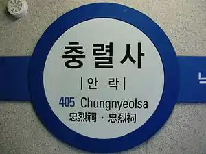 Chungnyeolsa Station (Korean: 충렬사역; Hanja: 忠烈祠驛) is an underground station of the Busan Metro Line 4 in Allak-dong, Dongnae District, Busan, South Korea.