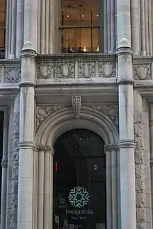 The main entrance is through a porch at the center of the Park Avenue facade. It consists of an archway, above which is a triangular pediment with a tympanum inside a bas-relief. The bas-relief is based on a scene from Christus Consolator, in which the ill are blessed by Christ.[12][19] On the tympanum itself, the left side shows Augustine of Canterbury preaching to British people in the sixth century, while the right side shows Samuel Seabury, the first American bishop of the Episcopal Church. Edward J. N. Stent carved the tympanum.[12][20] The spandrels at the top corners of the arch are decorated with icons inspired by 16th-century motifs.[19] Originally, a screen with large wrought-iron gates was at the Park Avenue entrance.[18] The remainder of the ground floor contains storefront windows, which are flanked by piers of rock-faced granite.[19]