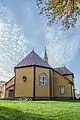 During the centuries, the wooden church was repaired and rebuilt many times. The church was rebuilt in 1648 and 1675. The present-day church was consecrated in 1774 and completed in 1778. It features folk architectural forms. In 1888, the church was enlarged by adding a sacristy and its altars were gilded. The church tower was built in 1867 and the belfry was added in 1899. The church and major buildings survive from 1899 without major alterations.[1] The church is built from wood. It has one nave but a Latin cross floor plan. Side chapels are separated from the main nave by wide segmental arches. The interior is decorated in folk Baroque style with wall and ceiling murals and Doric columns. The church has five altars.[5] Its pipe organ was built in 1854 and has 13 stops. Its pedal keyboard is not connected to the pipes and was likely added in the 20th century.[6] The belfry measures 6.4 by 4.26 metres (21.0 ft × 14.0 ft) and reaches 9 metres (30 ft) in height. It has a hip roof, two floors, and three bells named after Saints George, Joseph, and Thecla.[7]
