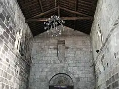 The interior nave is circled by frieze, with four slits flanked by columns and capitals, decorated with vegetal and geometric shapes over archways. The frontispiece likely included slits, with vestiges clearly visible in the interior.[1] Over the axial portico is a double archivolt and tympanum with the cord of Solomon, surmounted by a covered slit or niche, and the ceiling is covered in wood.[1] The triumphal archway to the presbytery is decorated by lions and leaves, columnar capitals and sculpted race, flanked by two frescoes representing Martírio de São Sebastião (Martyr of St. Sebastian) and Virgem de pé, com o Menino nos braços (Virgin Mary and Child). Above these features in the gabled-end is a sculpted Rosetta window.[1]
