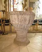 The nave is of 6-bay aisle-arcades with 4-centred arches. The baptismal font can be found on the east side of the north door and is a circular bowl carved from a massive piece of granite with eight panels - only three of which are carved. The font has been dated to about 1080[7] and is decorated with cables,[1] possibly indicating the transitional period between Saxon and Norman. The stem is of a later date. Local legend says that Oliver Cromwell's troops threw the font out during the Civil War and used it as an animal trough.[7][8] The screen at the base of the tower was made from bench ends which were salvaged when the Norman church was pulled down; it contains a good selection of early Tudor carving and the coat of arms of the famous local Grenville family.[3]