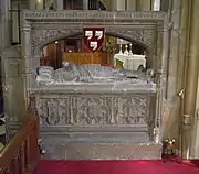 The pulpit dates to 1894 and is made of white marble veined with orange, green and red from Ashburton in south Devon and was carved by Devon craftsmen with attached columns and a figure of Christ.[1] To the right of the altar is the chest tomb of Sir Thomas Grenville, who died in 1513. The Grenvilles were patrons of the living of Bideford for several centuries. The tomb is of quatrefoil panels carrying a recumbent figure in armour; it and the tracery surrounding it are in approximately the same position as they were in the Norman church. Inscribed on the Tudor arch above is the following Latin text: