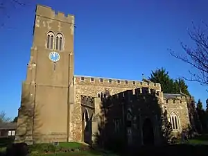 The present building dates from at least 1150 and was granted to Chicksands Priory by Payn de Beauchamp, founder of the Priory. This church was probably preceded by a series of wooden Saxon churches on the same site because in about 1890 excavations in the nave of the present church revealed a Saxon coffin containing human bones. The nave was built in 1150 and there are traces of a transept chapel in the north east aisle. The church is built of flint with Ashwell clunch stone dressings to the buttresses and is mainly in the Early Perpendicular style. In 1320 a north aisle was added to the structure which took in this transept chapel. In about 1370 part of the south aisle was extended to its present size by piercing the side walls with arches to open it up. The original outer facing can still be seen on the two thick piers, which were left as supports on either side. In about 1450 the tower was added and the chancel widened and it is believed that the baptismal font also dates from this time and is octagonal and panelled.[2][3]
