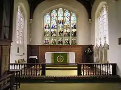 The rood screen is mainly late medieval, and is in five bays with the extra-wide middle bay being the entry. It has been much altered. The oldest parts are thought to have been in position after the restoration in the 1480s. Traces of the medieval paint colours of red, green, cream and gold still remain. At that time there would have been a small winding staircase (a vice) leading up to the top of the screen from behind the present pulpit. The doorway to the screen is still visible but the vice was bricked up in the Reformation. However the remains of the first few steps of the vice can be seen besides the modern pulpit.[4] The cornice infilling above the heads of the lights and gates are modern. In the north chapel can be found three remodelled pews, with an additional pew-end incorporated into modern seating. In the south chapel can be found two blocks of seating, each of four pews, similar to the seating in the north chapel but with original panelled fronts to the first pews. Nearby at the east end of the south aisle is a third panelled front incorporated into modern seating. With the exception of the first these seats are late medieval.[1][2]