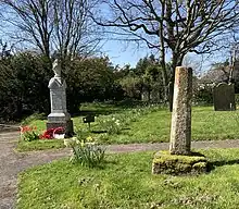 Near to the remains of the standing cross can be found the village war memorial, paid for by public subscription and unveiled in 1919.[7] This is a marble square pillar standing on a concrete base. Featured at the top of the pillar is a decorative marble urn which is half-covered with marble carved to resemble flowing cloth. On the pillar in lead lettering are the names of the six men of the village who died during World War I. Names of the four locals who died in World War II were added after that conflict.[8]