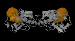 Chymopapain's structure was solved by X-ray diffraction techniques.[3] Analysis of this structure showed chymopapain to have 7 alpha helix regions, 10 beta sheet regions and 2 loop turns.[3] These 2 turns are the main difference between chymopapain's structure and other papaya proteinase proteins such as papain or caricain, which have similar conformations.[11][12]