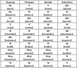 • Adyghe ч ↔ ж Kabardian: чэмы ↔ жэм (cow); чъыгы ↔ жыг (tree); чэщы ↔ жэщ (night); чылэ ↔ жылэ (village, settlement); пчъын ↔ бжын (to count); чъэн ↔ жэн (to run)