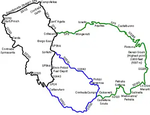 The Circuito delle Madonie was a road racing course made up of public roads, situated on the Italian island of Sicily, near the capital of Palermo, which hosted the famous Targa Florio event, between 1906 and 1977. The original public roads are still used today for the Targa Florio Rally successor event, which has been held since 1978. The course was made up of three different circuit length variations; the 72.00 km (44.74 mi) Piccolo short/small circuit,[4] the slightly larger 108.0 km (67.1 mi) Medio medium circuit,[5] and the full 148.821 km (92.473 mi) Grande circuit.[6]