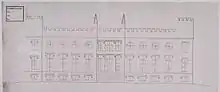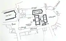 Survey of the Rijks-HBS Koning Willem II in 1866. Also the surrounding of the school is on the map, like the Saint Denis church. The buildings around the palace like the gym and the laboratory, which are both in one building, the art school and the caretaker's house were all demolished later.[1]