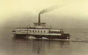 The City of Seattle was built in 1888 at Portland, Oregon by John Steffan and began regularly scheduled service on December 31, 1888.[1] The ferry had a wide lower deck, called the "driveway", which carried wagons, horses and carts, as well as all passengers. On the upper deck there was a single pilot house, facing both ends, which was built around the smokestack.[1]