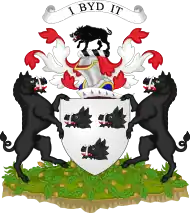 Crest: A boar passant Sable, armed Argent, langued Gules[1]