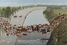 Starting in 1943, Williamson took several classes in drawing and painting at Southern Methodist University and the Dallas Museum School.[1] She quickly began working on what she called "memory paintings" that referred to incidents from her early rural life; these became a dominant theme in her oeuvre.[1] Often the underlying story or event figures in the title. Examples include Chicken for Dinner (1945), The Girls Went Fishing (1945–46), Standing in the Need of Prayer (1947, showing a revival meeting by torchlight), Texas Barn Dance (1951), The Day the Bosque Froze Over (1953), and The Night Before Christmas (1954).[1][2] She also made paintings whose subjects were more generic to the western United States, such as two paintings about cattle drives—Git 'Long Little Dogies (1945) and Old Chisholm Trail (1952)—and a painting about the coming of the railroad, The Building of the Railroad (1949–50). The cattle-drive paintings are unusual as a pair since Williamson hardly ever painted the same subject more than once.[1]