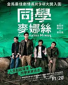 Classmates Minus (Chinese: 同學麥娜絲) is a 2020 Taiwanese political black comedy-drama film written and directed by Huang Hsin-yao, and starring Shih Ming-shuai, Cheng Jen-shuo, Nadow Lin, Liu Kuan-ting and Chen Yi-wen. The film was screened at the 57th Golden Horse Awards on November 5, 2020, and it had seen a theatrical release in Taiwan on the 20th of the same month. It was available for streaming worldwide via Netflix on February 20, 2021.[4]