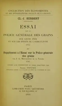 - Essai sur la police générale des grains, sur leurs prix et sur les effets de l'agriculture. Collection des économistes et des réformateurs sociaux de la France (in French). Paris: Paul Geuthner. 1910 [1755].