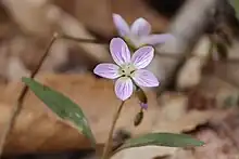 The flowers consist of five pink and purple petals. Dark pink veins accent the petals and give them a striped appearance.[6] The carpels are fused together.[4] They grow on a stem 3 - 10 inches tall that bears a single pair of broad leaves.[4] This distinguishes it from Claytonia virginica, which, although similar in other ways, has longer and much narrower leaves.[7] Claytonia caroliniana is similar to some of the Arctic claytonias, but is probably allied to Claytonia ozarkensis. Natural hybrids with Claytonia virginica have been documented[8]