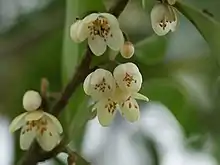 Cleyera japonica (sakaki) is a flowering evergreen tree native to warm areas of Japan, Taiwan, China, Myanmar, Nepal, and northern India (Min and Bartholomew 2015). It can reach a height of 10 m. The leaves are 6–10 cm long, smooth, oval, leathery, shiny and dark green above, yellowish-green below, with deep furrows for the leaf stem. The bark is dark reddish brown and smooth. The small, scented, cream-white flowers open in early summer, and are followed later by berries which start red and turn black when ripe. Sakaki is one of the common trees in the second layer of the evergreen oak forests. It is considered sacred to Japanese Shintō faith, and is one of the classical offerings at Shintō shrines including Tamagushi and masakaki .[1][2][3]