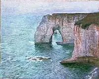 Monet first visited Étretat in winter 1868–1869, when he painted his first Stormy Sea at Étretat (Musee d'Orsay). From 1883 to 1886, he repeatedly visited the town and created a series of around fifty paintings of the coast nearby.[1]