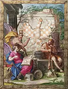The oldest color representation of the Moravian eagle is in the hall of the town castle (or palace) of Gozzoburg in Krems, Austria; Ottokar II of Bohemia ruled present-day Austria.[10] Since no later than the Luxembourg era, the silver-red checkered eagle was considered the coat of arms of the Moravian region.[11] According to some researchers, these colors derived from the colors of the Bohemian lion (a silver lion on a red shield) and linked Moravia to the king of Bohemia and the Czech monarchy.[12]
