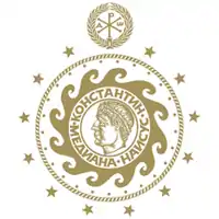 The larger coat of arms has two supporters, Stevan Sinđelić (leader of first Serbian Uprising) and Constantine the Great (Roman emperor born in Niš) holding two flags, Serbian flag with cross and four stylised letters "S" (same flag is used by Serbian Orthodox Church) and purple flag with laurel wreath and two-headed eagle. Underneath them is compartment represented by plains and motto with name of the city in Serbian, Greek and Latin representing history of the city. In the middle there is an escutcheon painted in Serbian colors (red, blue and white). In the centre of the shield there is Niš Fortress, standing beyond Nišava river. Above the fortress there is Serbian eagle similar to those on the flag held by Constantine the Great. Crest is shown as a stone crown, and over it there is a Chi Rho with Greek letters alpha and omega on the sides.[1]