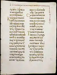 The leaves are unbound and are kept in loose quires.[6] The text is written in late uncial script, in two columns per page, with mostly 19 lines per column,[1] in large uncial letters. Palaeographically the writing is close to the Codex Seidelianus I.[4]