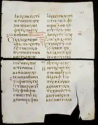 The letters Η, Μ, Ν, and Π, are square, the letters Ε, Θ, Ο, Σ, and Φ have a round shape.[7] The letters Δ, Ε, Θ, Ο, and especially Ψ in cruciform, are of the form characteristic for the late uncial script. Φ is large and bevelled at both ends.[3] The letters were written by an 'elegant and careful' hand.[7]