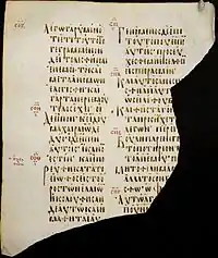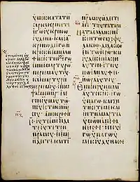 The breathings (rough and smooth breathing) and accents (see e.g. Greek diacritics) are given fully and usually correctly.[3] The breathings are indicated by sigla ⊢ and ⊣, often used in codices from the 9th and 10th century.[9] In some cases breathings are given incorrectly (e.g. Matthew 9,7.16).[10]