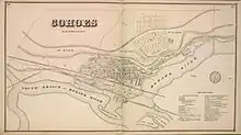 In 1831, a new Cohoes Company constructed a dam on the Mohawk River above the city's waterfall in order to better regulate water flow for industrial use. It was soon swept away by ice at the break-up in spring, and a new dam was built the following year. Two canals extended from the dam to provide water power for industry.[4] Ironworks were the first main industry in Cohoes, as it was in Troy, Menands, and West Troy. Daniel Simmons' Simmons Axe Company was famous throughout the United States, and the Cohoes Iron Foundry was a large business enterprise in the 1830s.[6]