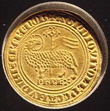 The Agnel d'or ("golden lamb") was the last gold coin of the reign of Philip the Fair. It had a weight of 4.13g and was composed of pure 24 karats gold. Its value was one Livre tournois or 15 Parisis sols (Sous Parisis).