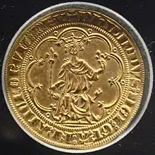 The "Chaise d'or" ("Golden throne") was a gold coin with the depiction of a large Gothic throne on which the king was seated. It was produced from August 22, 1303, and had a title of 1.000.[2] This coin was an authentic double Florin, with a weight of 7.10g at 24 karats. It was meant to erase the memory of the debased billon coins which had been in circulation. This coin incorporates the first elements of Gothic architecture ever on a French coin.