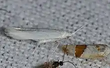 The larvae feed on the leaves of Prunus, Rosa, Amelanchier, Betula, Alnus, Juglans, Myrica, Comptonia, Salix, Populus and Fraxinus species. They create a composite leaf case. The silken case is tubular at first. Young larvae overwinter in this case. In spring, the case is attached to a larger, irregularly oval section formed by cutting out a portion of the mine, and the early section is discarded.[2]