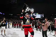 Campbell celebrating the Calder Cup victory with the Griffins in 2017.