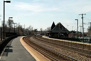 College Avenue is one of two stations on Metra's Union Pacific West Line located in Wheaton, Illinois. The station is located at 303 North President Street, and lies next to Wheaton College. The station is located 23.8 miles (38.3 km) away from Ogilvie Transportation Center, the eastern terminus of the West Line.[2] In Metra's zone-based fare system, College Avenue is in zone E. As of 2018, College Avenue is the 47th busiest of the 236 non-downtown stations in the Metra system, with an average of 1,059 weekday boardings.[1] Unless otherwise announced, inbound trains use the north platform and outbound trains use the south platform.