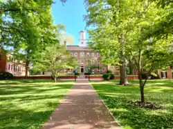 The College Green of Ohio University is the university's centralized quadrangle lawn which saw the first academic buildings in the former Northwest Territory.[2] The yard sits roughly aligned to cardinal directions, with Manasseh Cutler Hall facing true north. The Green, at the heart of the Athens campus, is surrounded by administrative, academic, and library buildings named for figures that played pivotal roles in university history: Manasseh Cutler, Robert Wilson, William McGuffey, and Vernon Alden to name a few.[3] The most prominent three structures which adorn College Green, all over 200 years old and made of red brick, are featured on the official university logo and set the university's Federal appearance: Cutler Hall, originally constructed in 1816 as the College Edifice but not officially open until 1819 due to a fire, is the home of the President's office; Wilson Hall built 1837 houses the College of Arts & Sciences; and McGuffey Hall was built 1839. For most of the nineteenth and twentieth century, College Green saw small memorials and wartime monuments dedicated in remembrance of the people involved in those centuries' great conflicts.[4] The Green is the centerpiece of a historic district listed on the National Register of Historic Places in 1979, encompassing the collegiate yard, flanking buildings, and other nearby campus buildings.