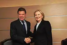 President of Colombia, Juan Manuel Santos and U.S. Secretary of State, Hillary Clinton seeking business relationships.