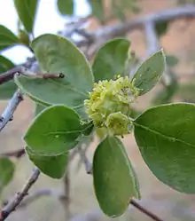 The thorny shrub has deciduous leaves, oval in shape and coated in silky hairs. The inflorescence is a dense cluster of several tiny nectar-filled flowers. It blooms in April and May after the ground is moistened with rain.