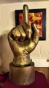 The Mahnhand, erroneously called the Oath-hand, is made of copper-plate, is about 1.05 m large and 0.7 m wide and weighs 13.1 kg. The fact that the hand appears golden today is due to a coating that was applied as a permanent protection against corrosion. When the tower was opened for the first time in 1928, a life-size white statue of Christ made of Carrara marble was found inside. The owner, Friedrich's eldest son, Medical Officer of Health Alphons Friedrichs (* October 10, 1868 in Meiningen) left it to the parish of Cond, which had it installed in the War Memorial Chapel in the former steeple of St. Remaclus Church. The hand was probably removed from the roof of the tower around 1932. When the property with the tower on it was sold again in the 1960s, the new owner removed the roof construction because the roof was no longer in good condition.