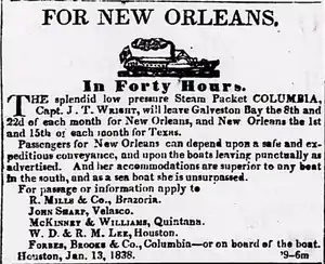 This reorganized partnership then consisting of just Morgan and Haggerty is considered the beginning of the Charles Morgan Line, with Columbia known as its first ship. James Reed & Company, Columbia's agent in New Orleans, purchased shares in the steamer, even briefly owning a majority interest before liquidating on 31 October 1838. In early 1838, Columbia made a dozen runs between Galveston and Velasco, Texas, a town at the mouth of the Brazos River. At that time, the owners of the steamship Columbia formed a cartel with the owners of the steamship Cuba, an arrangement known to the public as the New Orleans and Texas Line. These arrangements included coordination of scheduling, rates, and freight. The New Orleans and Texas Line dominated this steamship market for a few years.[5]