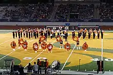The Commerce High School Roarin' Tiger Band performing at a football game in 2015