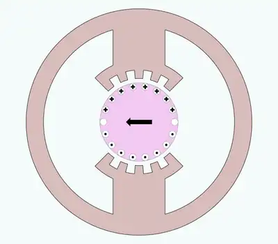 ![]() A. Cross section of DC motor with compensation windings. A = armature windings, C = compensation windings, F = field windings, R = rotor (armature), S = stator (field). |