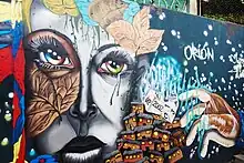 Members of the Comuna 13 have been able to express themselves and share stories through art. From poetry to graffiti to gardens, the diverse forms of artistic expression are everywhere to be found. Colorful murals with depictions of community figures, past violence, and neighborhood injustices can be seen throughout the neighborhood.[26] One of the most recognized graffiti artists coming out of the neighborhood is Chota 13.[27] Hip-hop and break dance performances are common in the streets.[28] Poets, singers, and rappers tell stories and use their platforms to address social issues in the community. Events are held in public spaces with discussions and speeches.[20]