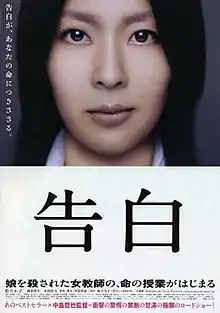 Confessions (告白, Kokuhaku) is a 2010 Japanese psychological thriller film directed by Tetsuya Nakashima, based on author Kanae Minato's 2008 debut mystery novel that won the 2009 Honya Taisho award (Japan Booksellers Award).[2] The film was both a commercial and critical success. It was awarded Best Picture at the 34th Japan Academy Prize and 53rd Blue Ribbon Awards and was shortlisted at the 83rd Academy Awards for Best Foreign Language Film.
