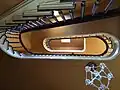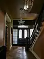 The vestibule is a small space approximately 16 feet square. It's the first space encountered upon entering the home and is separated from the foyer by a double-door. The foyer contains access to the main staircase with a large carved newel post made from cherry and Birds-Eye Maple. The staircase and landings are cantilevered above the first floor and feature a continuous varnished maple railing supported by 102 turned spindles.