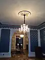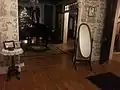 The first parlor, also known as the "blue room" or "Music room" features blue wallpaper inside of decorative wall moldings and is the scene of most seasonal celebrations. During the Christmas season the largest tree is placed in the bay window of this room. It houses the grand piano and Victrola, among other instruments.
