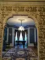 The second parlor, also known as the "drawing room" or "ladies salon" features white wallpaper depicting gnarled trees and fanciful scenes. It contains a large white tile fireplace and mantle straddled by ornately carved wooden griffons.