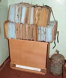 A herbarium is a collection of preserved plant specimens and associated data used for scientific study.[2] Originally, the word "herbarium" referred to books about medicinal plants. In 1700, French botanist Joseph Pitton de Tournefort used the word to describe a collection of dried plants and Carl Linnaeus continued to use this term in his work which is where the term caught on. Initially, herbarium collections were bound in volumes instead of on individual sheets as it is done today.[3] It is not exactly known how long dry plant specimens last in storage, but with proper conservation, they have been able to last many years. Specimens collected by Linnaeus in the eighteenth century and by Banks and Solander on the Endeavour voyage in 1788 are still excellently preserved.[4] The specimens may be whole plants or plant parts. These will usually be dried and pressed and mounted on a sheet of paper but, depending upon the material, may also be stored in boxes or kept in alcohol or other preservatives.[5]