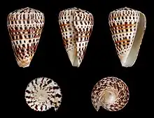 Five views of a shell of Conus byssinus (Röding, P.F., 1798)