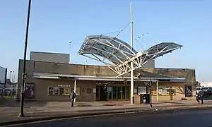 The station is staffed during all opening hours and has platform CCTV.[6] There are toilets, a payphone, a vending machine, booking office and live departure and arrival screens, for passenger information. The station does not have a free car park, though there is a drop-off point on Europa Boulevard, as well as a "Pay and Display" car park, to the rear of the station as viewed from Birkenhead town centre. Step-free access to the platforms, for wheelchairs and prams, is possible, via the lifts.[7] Each platform also has sheltered seating. Free Wi-Fi was introduced in October 2015.[8] There is secure cycle parking for 10 cycles.[9]
