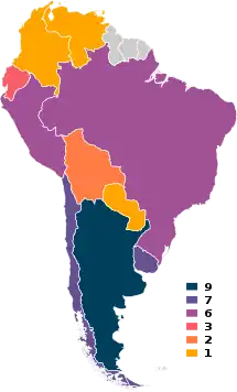 Since 1993, the tournament has generally featured 12 teams—all 10 CONMEBOL teams and two additional teams from other confederations. Mexico participated in every tournament between 1993 and 2016, with one additional team drawn from CONCACAF, except for 1999, when AFC team Japan filled out the 12-team roster, and 2019, which featured Japan and Qatar. The 2016 version of the event, Copa América Centenario, featured 16 teams, with six teams from CONCACAF in addition to the 10 from CONMEBOL.[5] Mexico's two runner-up finishes are the highest for a non-CONMEBOL side.