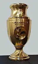 In April 2016, a commemorative trophy – specifically designed for the Copa América Centenario – was introduced at the Colombian Football Federation headquarters of Bogotá to commemorate the 100th anniversary of the competition.[32] The trophy was based on the original Copa América trophy's shape, added with the 2016 edition logo. The trophy was not to have a base. The CAC was 61 cm (24 in) tall with a weight of 7.1 kg (16 lb), covered by 24-carat gold. The emblems of CONMEBOL and CONCACAF were also engraved on its body.[33]
